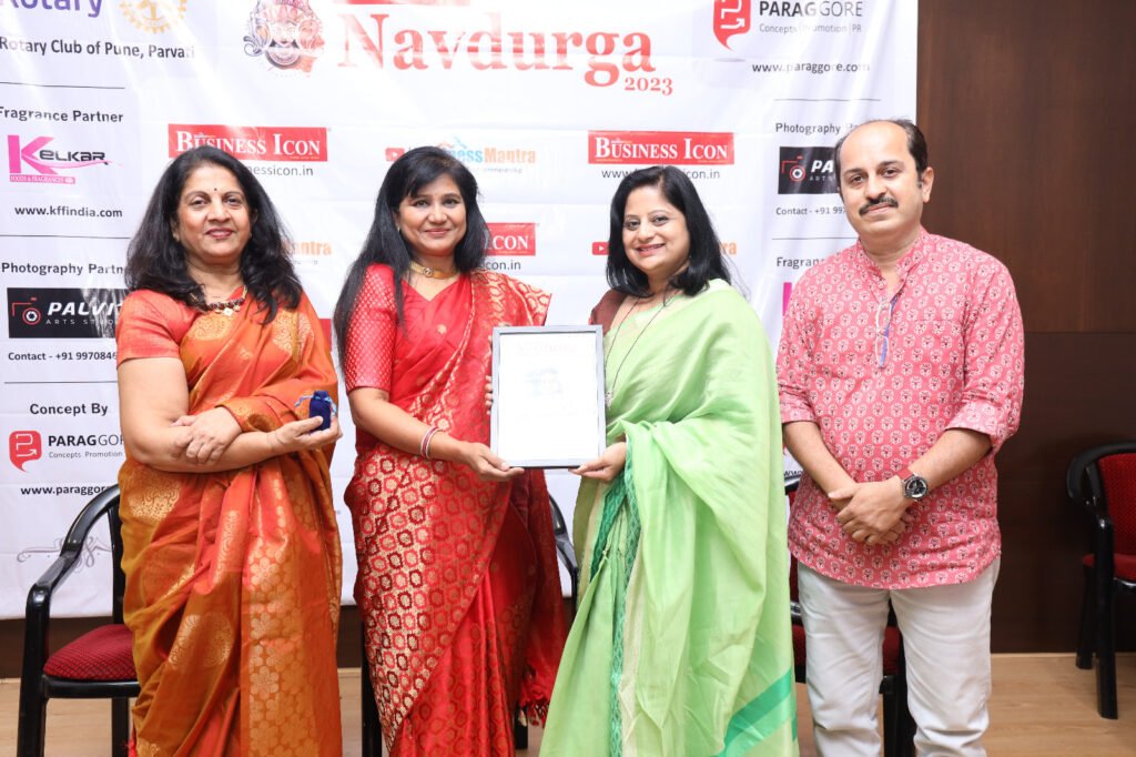 Congratulations to our founder, Bhagyshree, on being honored at Utsav Udyoginicha 2023 during this Navratri-special event. The award was presented by Mrs. Zelam Chaubal, Director of Kesaro Tours, and Mrs. Rashmi Kulkarni, Former District Governor of the Rotary Club, Pune, in recognition of their outstanding contributions to the business world.